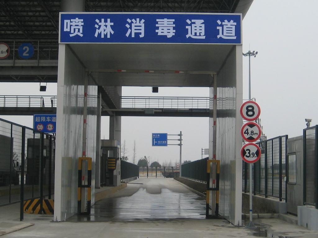 畜牧養(yǎng)殖場、農(nóng)場、飼料廠、屠宰場、海關(guān)、港口、工業(yè)園區(qū)、疫區(qū)、動物檢查防疫站、動物衛(wèi)生監(jiān)督檢查站等場所進出口対通行的車輛進行